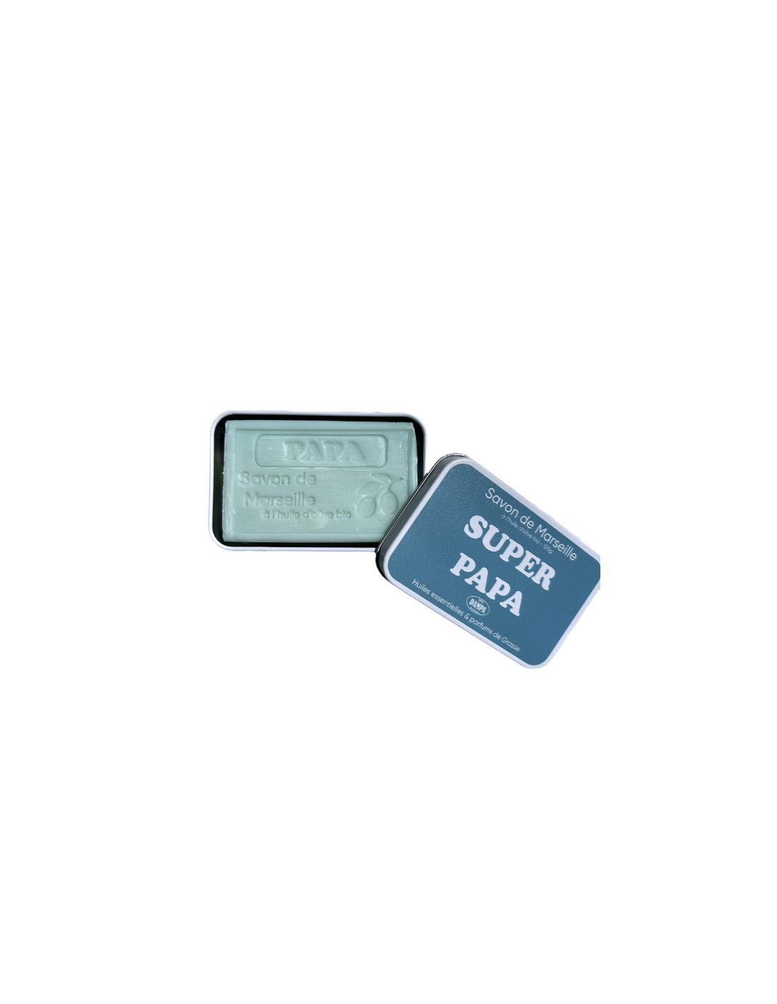 Etui en métal "Super Papa" avec son savon de Marseille "Papa" 125 gr. aux huiles végétales et huile d 'olive bio. Parfum : masculin. Fabriqué en France (13) artisanalement.