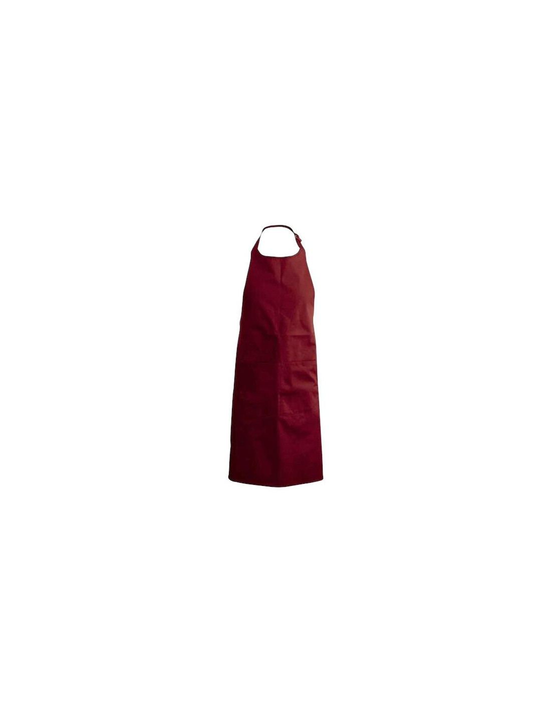 100% cotton apron 250g/m². 2 colors available: black, wine red. Dimensions 70x90cm. 2 pockets on the front. Neck adjustment buckle. Screen printing.